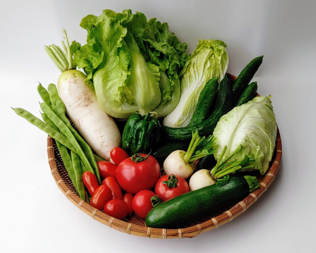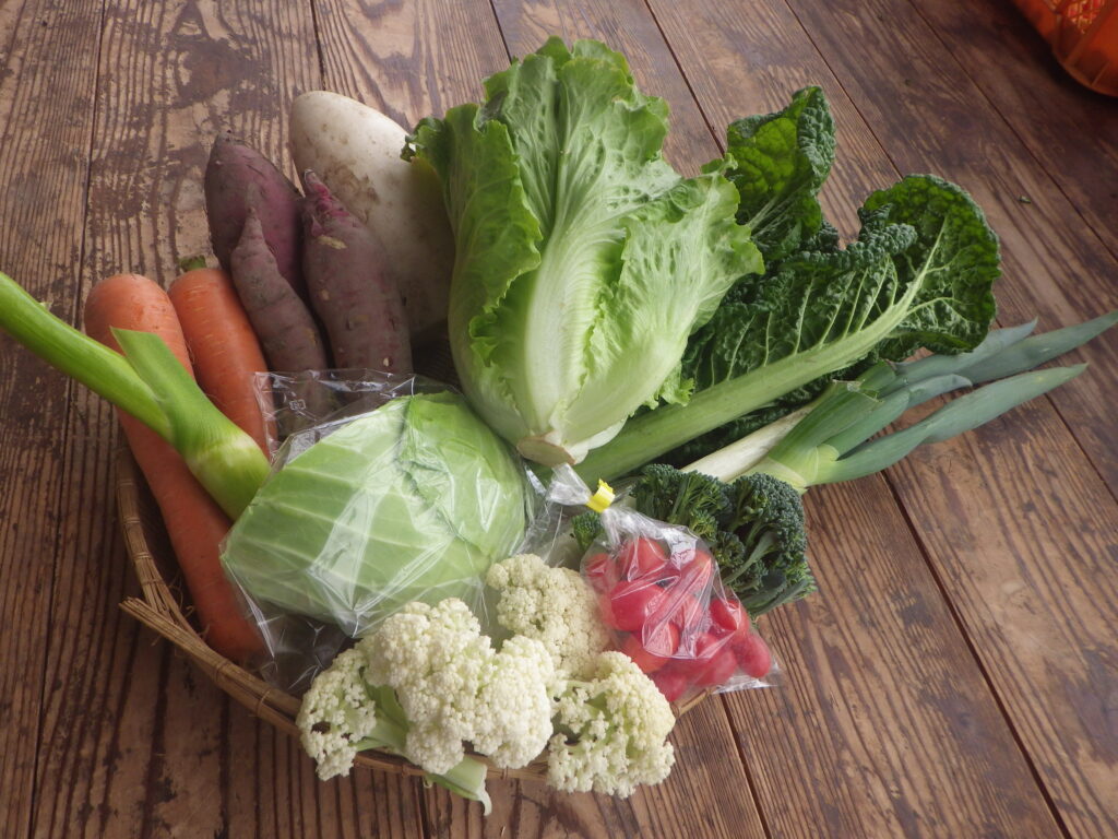 キャベツ、ブロッコリー、カリフラワー、かぶ、大かぶ、赤カブ、大根、ほうれん草、 小松菜、チンゲン菜、山東菜、水菜、みぶ菜、かぼちゃ、白菜、 ねぎ、やまといも、さつまいも、ターサイ、春菊、レタス、人参、 ジャガイモ、サラダセット、ニンニクなど