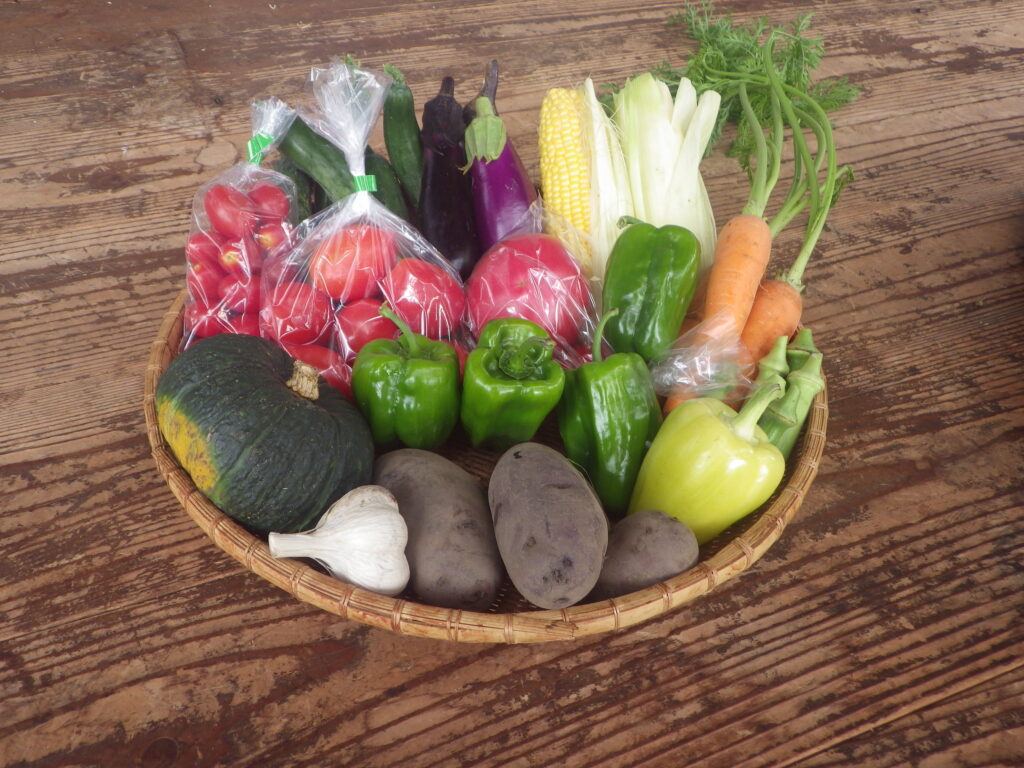 人参、にんにく、ズッキーニ、きゅうり、なす、ピーマン、赤ピーマン 枝豆、ししとう、トマト、ミニトマト、じゃがいも、とうもろこし、 モロヘイヤ、いんげん、玉ねぎ、大葉、坊ちゃんカボチャなど