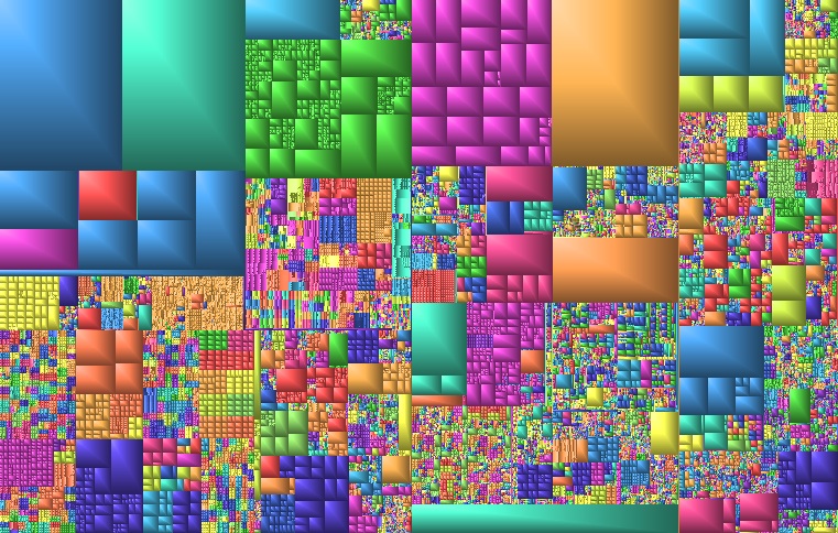 ひとつの四角がひとつのファイル、その四角の含まれる矩形(?)がフォルダ、という感じと思います。ぱっと見て大きなファイル(例えばParallelsのディスクイメージ/左上の青と緑、赤、紫のカタマリ)はわかりますし、大きめなファイルがかたまっている領域は大きなファイルが入っているフォルダ(例えばLinuxのインストールCDの1〜6まで)とか分かります。