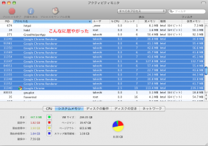 くそー、Safariメモり喰いまくりやがってChromeはそうでもなさそうだぞ、とアクティビティモニタを見るとChromeとその仲間達が結構おりまして。合計したらどのくらいになるのかと(以上導入の物語)。